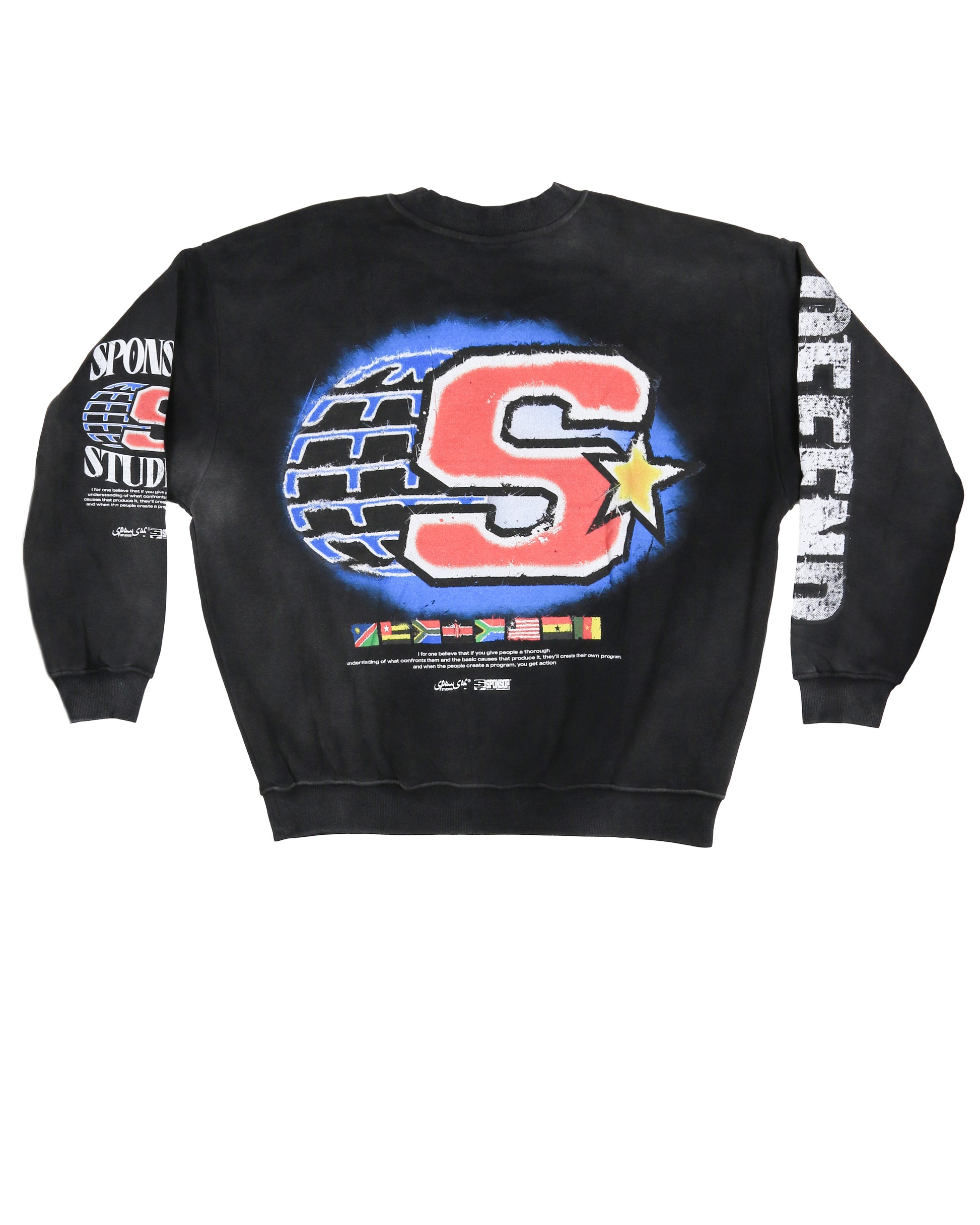 Men's crewneck graphic printed sweatshirt in a sun faded vintage look with high quality heavy weight cotton/polyester fabric. Features a chest, back and sleeves printed design.