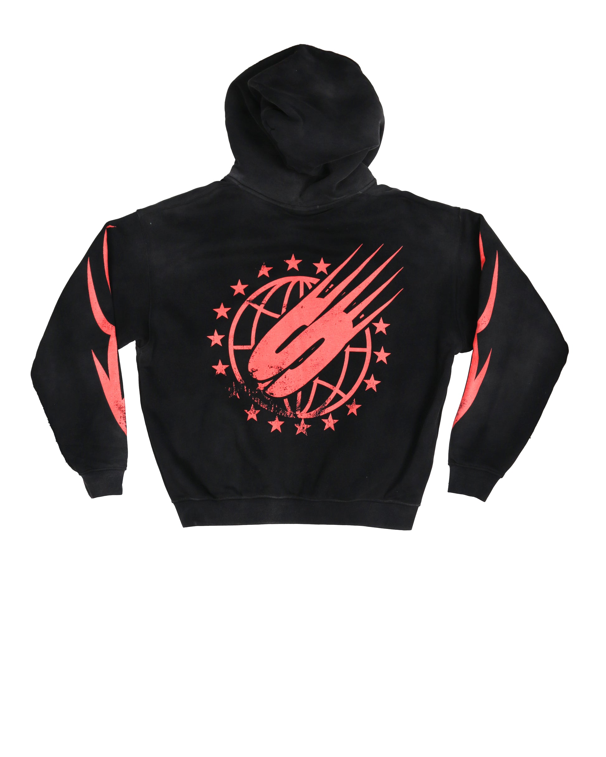 Men's zip up graphic printed sweatshirt hoodie in a sun faded vintage look with high quality heavy weight cotton/polyester fabric. Features a chest, back and sleeves printed design.