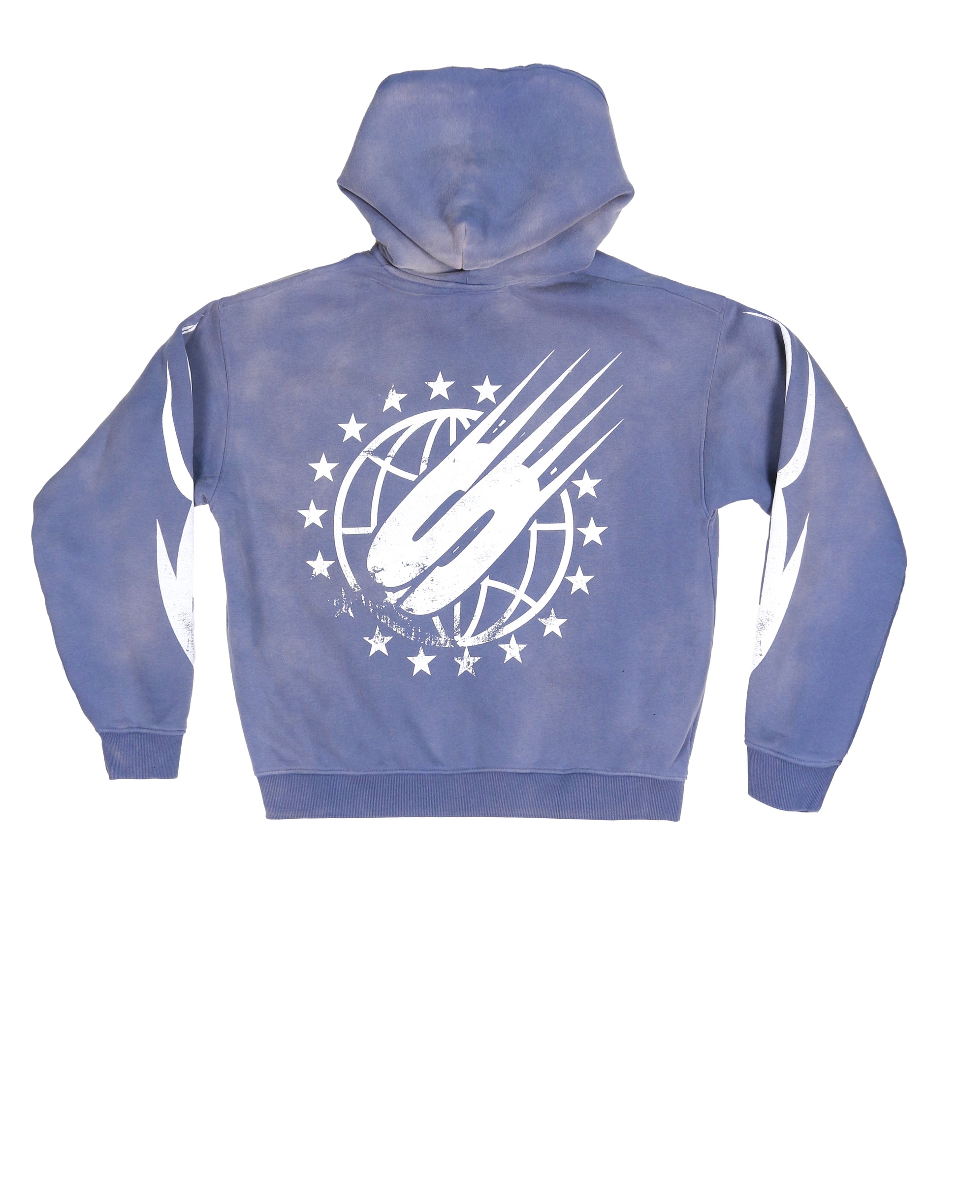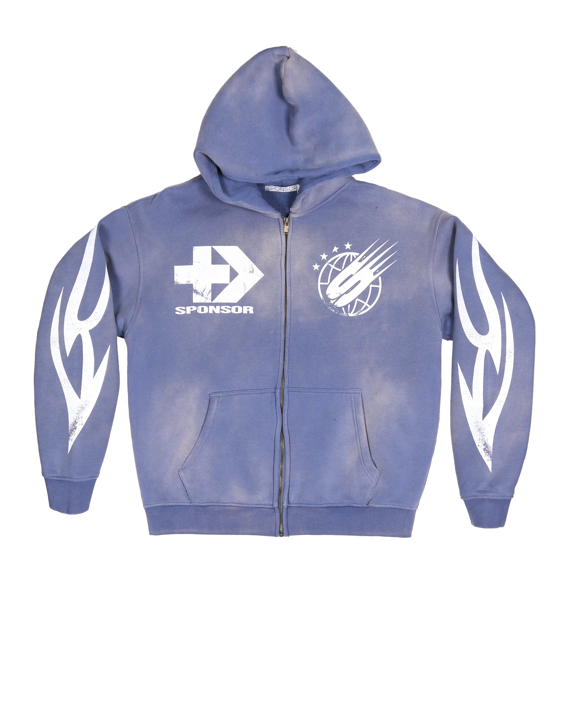 Men's zip up graphic printed sweatshirt hoodie in a sun faded vintage look with high quality heavy weight cotton/polyester fabric. Features a chest, back and sleeves printed design.